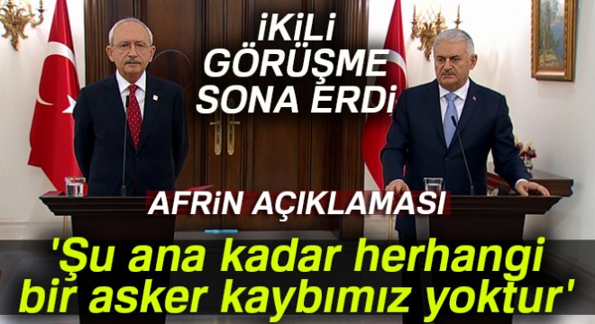Başbakan Binali Yıldırım, Çankaya Köşkü'nde CHP Genel Başkanı Kemal Kılıçdaroğlu ile bir araya geldi. Basına kapalı gerçekleşen ve gündemin Afrin olduğu görüşme sonrası iki isim kameraların karşısına geçti. Başbakan Yıldırım, konuşmasında, "Türkiye, 20 Ocak itibarıyla Suriye'nin Afrin bölgesine orada uzun süreden beri konuşlanmış terör örgütü elemanlarını, terör faaliyetlerini yok etmek amacıyla bir harekat başlatmıştır. Harekatın adı 'Zeytin Dalı'. Bu az çok anlamlı, çünkü Afrin zeytiniyle meşhur bir bölge. Burada Afrin'e yapılan harekat bir barış harekatıdır. Afrin'de yaşayan Arap, Türkmen, Kürt ve diğer etnik gruplara sahip yerel halkın PKK, DEAŞ terörünün baskısından kurtarılması, onların özgürlüğüne kavuşturulması, yerlerinden, yurtlarından edilmesinin önüne geçilmesi. Burada Sayın Genel Başkanın da belirttiği gibi, Hassasiyetlerimiz var, hassasiyetlerimiz nedir? Suriye'nin toprak bütünlüğünün korunması ve bölgede terör örgütlerinin baskı, zulüm yaparak halkı yıldırmalarının önüne geçilmesi, bütün bunu yaparken de tabii ki sivillerin zarar görmemesi. Bu çerçevede başlatılan harekat başarıyla devam ediyor. Bugün üçüncü günündeyiz. İlk iki gününde yapılan çalışmalarda doğrusu 100'ün üzerinde muharip uçakla belirlenen 170'ten fazla hedef imha edilmiş ve uçaklarımız görevini tamamlayarak yerlerine dönmüştür. 21 Ocak itibarıyla da kara harekatı başlamış bulunmaktadır. Şu ana kadar herhangi bir asker kaybımız yoktur, ancak Kilis'te konuşlu askerlerimize taciz saldırıları olmuş ve bir askerimiz hafif şekilde yaralanmıştır" ifadelerini kullandı.