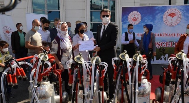 Çat ilçesinde 'Pamuk Eller Nasır Tutmasın' projesi kapsamında 89 çiftçiye süt sağım makinesi dağıtıldı.