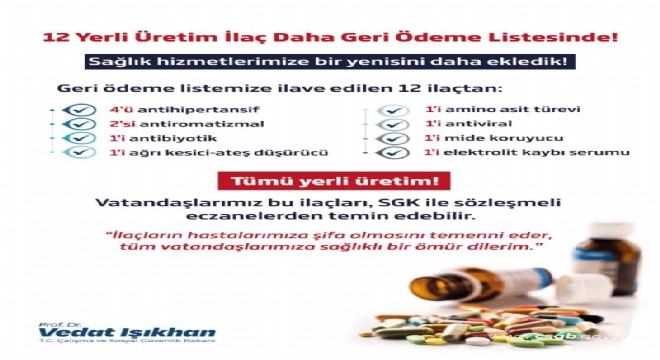 Çalışma ve Sosyal Güvenlik Bakanı Vedat Işıkhan, tamamı yerli üretim olmak üzere 12 ilacın geri ödeme listesine alındığını açıkladı.