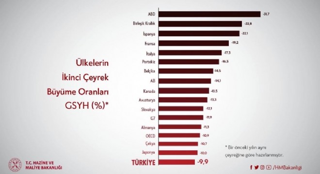 Ayrıca ülkelerin ikinci çeyrek büyüme oranlarının yer aldığı bir grafik de paylaşan Bakan Albayrak, “Dünya ekonomilerini durma noktasına getiren yüzyılın felaketi pandeminin etkilerini 2. çeyrekte hissedeceğimizi biliyorduk. Kötümser tabloların aksine GSYİH oranımız dünya ülkelerine kıyasla iyi bir sonuç verdi. Türkiye ekonomisinin temelleri sağlam, dinamikleri kuvvetli” ifadelerine yer verdi.İHA