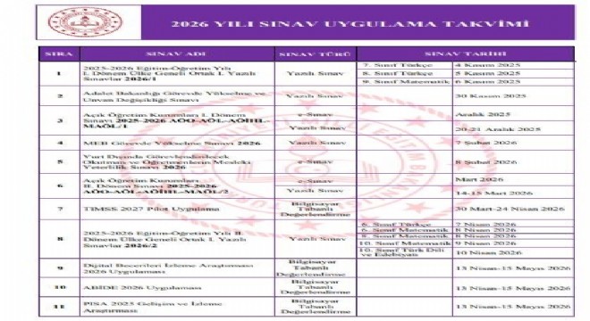 Milli Eğitim Bakanlığı tarafından 2026 yılı sınav uygulama takvimi yayımlandı.