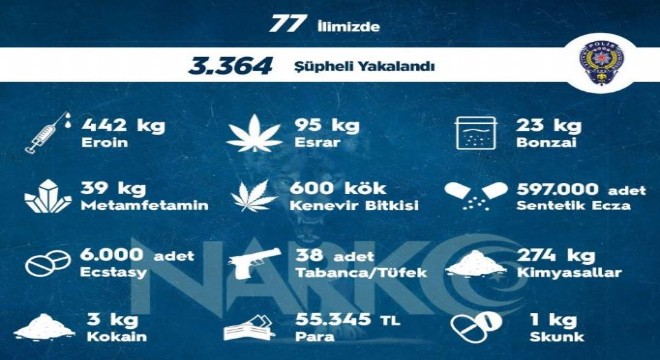 Emniyet Genel Müdürlüğü, uyuşturucu ticaretini önlemeye yönelik 77 ilde düzenlediği 'Sokak' operasyonlarında bir hafta içerisinde şüpheli görülen 3 bin 364 kişiye adli işlem uygulandığını açıkladı. Söz konusu operasyonlarda; 442 kilogram eroin, 95 kilogram esrar, 23 kilogram bonzai, 39 kilogram metamfetamin, 600 kök kenevir bitkisi, 597 bin adet sentetik ecza, 6 bin adet ecstasy, 274 kilogram kimyasallar, 3 kilogram kokain, 1 kilogram skunk, 38 adet tabanca/tüfek ve 55 bin 345 TL ele geçirildi.