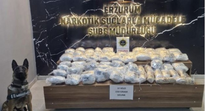 Erzurum Emniyet Müdürlüğü Narkotik Suçlarla Mücadele Şube Müdürlüğü ekiplerince Narkotik Madde Arama Köpeği Hera ile yapılan kontroller neticesinde; 37 kilo 150 gram skunk maddesi ve 19 bin 500 TL para ele geçirildi. Konuyla ilgili yakalanarak adli mercilere sevk edilen şahıs tutuklanarak Ceza İnfaz Kurumuna teslim edildi.