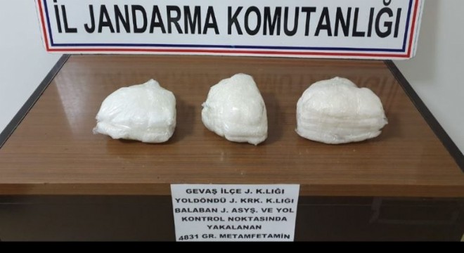 Edinilen bilgiye göre, Gevaş İlçe Jandarma Komutanlı ekipleri tarafından Van-Bitlis karayolu üzerinde bulunan Balaban Jandarma Asayiş ve Yol Kontrol Nokatası'nda durumunda şüphelinilen bir otomobilde arama yapıldı. Yapılan aramda otomobilin torpido gözünde 4 kilo 831 gram metamfetamin ele geçirildi.