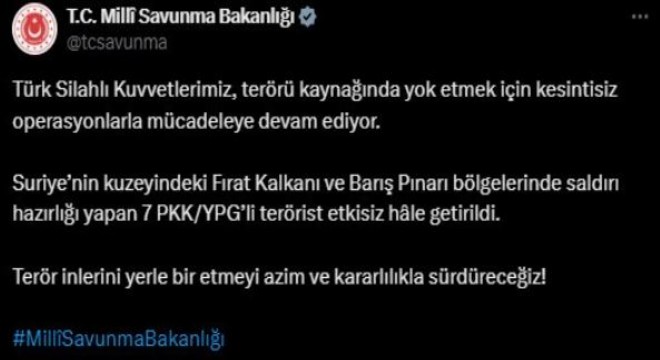 Milli Savunma Bakanlığının sosyal medya hesabından yapılan açıklamada, terör kaynakları yok edilene kadar kesintisiz operasyonlara devam edileceğine dikkat çekilerek, "Suriye’nin kuzeyindeki Fırat Kalkanı ve Barış Pınarı bölgelerinde saldırı hazırlığı yapan 7 PKK/YPG’li terörist etkisiz hale getirildi. Terör inlerini yerle bir etmeyi azim ve kararlılıkla sürdüreceğiz" ifadesi kullanıldı.