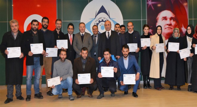 Son olarak, ETSO ile KOSGEB’in ABİGEM aracılığıyla ortaklaşa düzenlediği girişimcilik eğitimini tamamlayan 90 kursiyere sertifikaları düzenlenen törenle verildi. ETSO Konferans Salonu’nda gerçekleştirilen törene, ETSO Genel Sekreteri Av. Harun Delibaş, KOSGEB Erzurum Hizmet Merkezi Müdürü Veysel Vural, ABİGEM A.Ş. Şirket Müdürü ve ETSO Genel Sekreter Yardımcısı Kürşat Karagöl, kursiyerler ve aileleri katıldı.