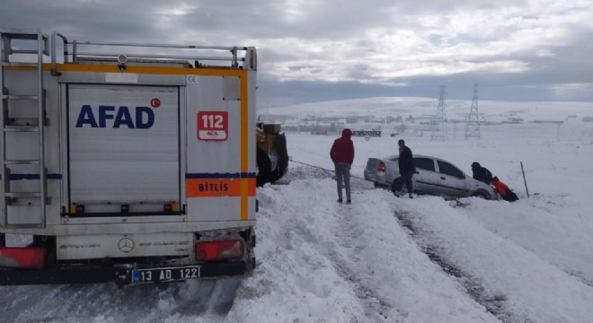 Ahlat ilçesinde yoldan çıkarak kara saplanan otomobil, AFAD ve Karayolları ekipleri tarafından kurtarıldı.
