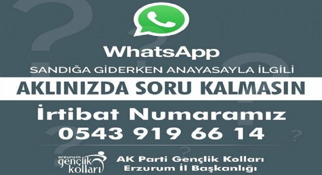 Özellikle kararsız seçmenlere ulaşarak kararlarını evet yönünde kullanmayı hedefleyen AK Parti Erzurum Gençlik Kolları, ulaşamadığı kararsız seçmenler için özel bir whatsapp hattı kurdu.
