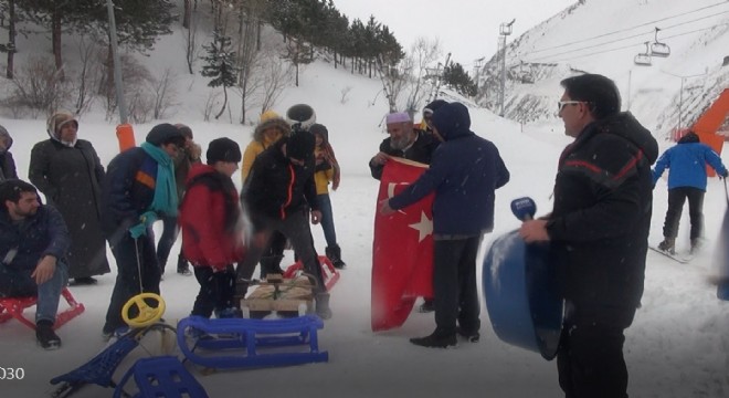 Cemal Polat dedenin bayrak açarak çamaşır leğeniyle kaydığını gören kayak severler onu alkışlayarak kutladı.