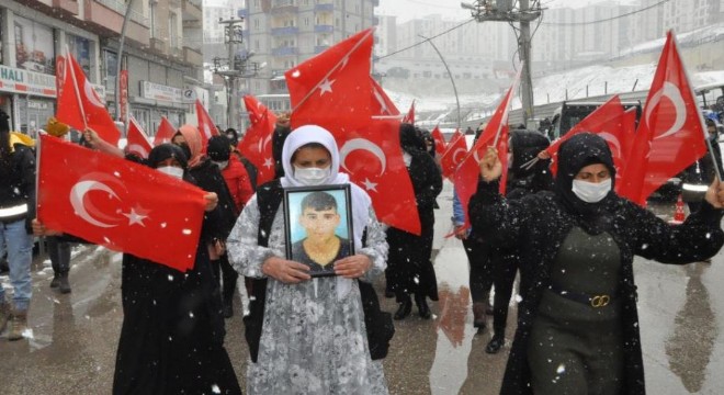 Şırnak anneleri ile şehit yakınları yoğun kar yağışı altında HDP Şırnak il binasına yürüyerek eylem düzenledi. PKK’lı teröristlerce çocukları dağa kaçırılan Şırnaklı kadınlar ile şehit yakınları yürüyüşün ardından HDP İl Başkanlığı binası önüne geldi. Yoğun güvenlik önlemleri altında ellerinde Türk bayrakları ile HDP il binasına yürüyen kadınlar, terör örgütü PKK’ya ve HDP’ye tepkilerini dile getirdi. Kadınlar sık sık 'Kahrolsun PKK', 'Şehitler ölmez vatan bölünmez', ’Kahrolsun PKK, tırnakçı HDP' ve 'Kahrolsun PKK, işbirlikçi HDP', 'Kürt-Türk kardeştir, PKK kalleştir' sloganları attı.