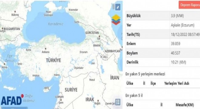 Afet ve Acil Durum Yönetimi Başkanlığı'ndan (AFAD) alınan bilgilere göre, 0Erzurum'da saat 11.57'de 3.9 büyüklüğünde bir deprem meydana geldi. Aşkale ilçesi merkezli deprem, yerin 10.21 kilometre derinliğinde gerçekleşti.