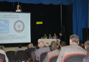 Aşkale Halk Eğitim Merkezinde düzenlenen toplantıya İlçe Kaymakamı Hayrettin Çiçek, Garnizon Komutanı Yüzbaşı M.Deniz Işılar, Belediye Başkanı Enver Başaran, İlçe Emniyet Müdürü İlhan Yalçın, AK Parti ilçe Başkanı İrfan Kervan, MHP İlçe başkanı Kadir Kılıç, Saadet Partisi ilçe başkanı Nusret Bilen ve mahalle muhtarları katıldı.