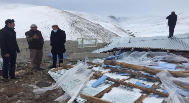 Aşkale’de şiddetli rüzgar ahırın çatısını uçurdu