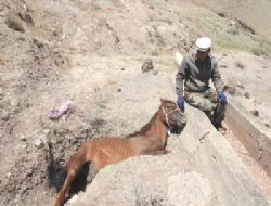 Erzurum'un Oltu ilçesinde çukura düşen sahipsiz at, çevredeki vatandaşlar tarafından çıkarıldı.