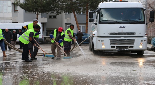 Aziziye Belediyesi Temizlik İşleri Müdürlüğü havaların ısınmasıyla birlikte ilçede temizlik seferberliği başlattı. Ağır kış koşullarından tahrip olan yollar ve kaldırımlar bakıma alınırken, cadde ve sokaklar da kapsamlı bir şekilde tazyikli su ile yıkanarak temizleniyor.