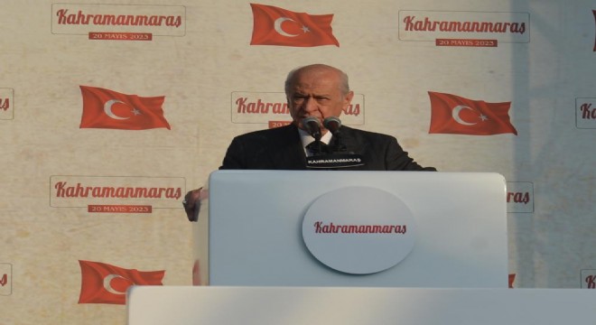 "28 Mayıs'ta Cumhurbaşkanı Recep Tayyip Erdoğan'ı 13. dönem cumhurbaşkanı yapmak mecburiyetindeyiz" diyen Bahçeli, "Bu oylar Kahramanmaraş'ta doruğa zirveye çıkmış, yüzde 71’e ulaşmıştır. Şimdi yeni bir seçimin tekrar arifesindeyiz. Aziz Kahramanmaraşlılar yüzde 71’den geri adım yok. Olmamalı. O sebepten dolayı sandığa nasıl gittiysek 28 Mayıs'ta tekrar gitmeliyiz. Sandıkta elimize alıp Sayın Recep Tayyip Erdoğan'a ve onu oluşturan Cumhur İttifakı partilerine oy verdiğiniz gibi bu kez iki aday üzerinde tek bir vuruşu Sayın Cumhurbaşkanımız Recep Tayyip Erdoğan'a yaparak 28 Mayıs'ta onu ikinci dönem, bir başka ifadeyle 13. dönem Cumhurbaşkanı yapmak mecburiyetindeyiz. Böyle bir çabaya söz veriyor muyuz? Sandığa gidiyor muyuz? Recep Tayyip Erdoğan diyor muyuz? 13. cumhurbaşkanını seçiyor muyuz? Öyleyse komşu bir ilin çocuğu olarak size bir şey söylüyorum. Adana'da çok konuşulur. Karada yüz, denizde yüz, havada yüz, ama 14 Mayıs'ta 71 noktayı geçmiş bir Kahramanmaraş için şimdi 28 Mayıs'ta Kahramanmaraş'ta yüz diyoruz. Söz mü? Havada, karada denizde olduğu gibi Türkiye'yi yeni bir yüzyılda yüzüncü yıl dönüm olarak kutlayacak mıyız?” şeklinde konuştu.
