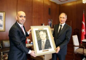 Marmara Oltulular Derneği Başkanı Fatih Hiçdurmaz, çakıl taşlarından yapılan portre resmi İçişleri Bakanı Efkan Ala’ya hediye etti.