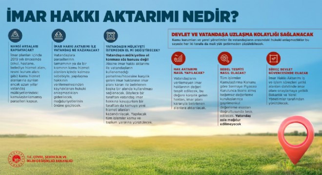 Çevre, Şehircilik ve İklim Değişikliği Bakanlığından İmar Hakkı Aktarımı’na ilişkin yapılan açıklamada, “Vatandaşlara parsellerinin tamamının ya da bir kısmının kamu hizmet alanları içinde kalması sebebiyle, yapılaşma hakkının verilememesinden kaynaklanan hukuki anlaşmazlıkları giderilecek, mağduriyetlerinin önüne geçilecek” denildi.