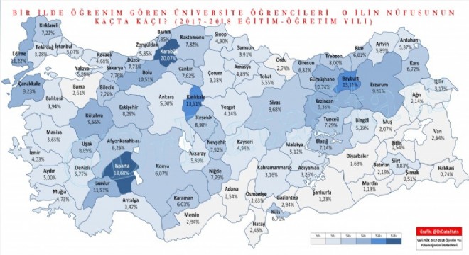 Yükseköğretim Kurulu’nun (YÖK) 2017- 2018 eğitim-öğretim yılı istatistiklerine göre Türkiye’de üniversitelerde önlisans, lisan, yüksek lisans ve doktora düzeyinde örgün ve ikinci öğretime kayıtlı toplam öğrenci sayısı 3.887.682 olduğu açıklandı. Üniversite öğrenci sayıları verileri YÖK’ün 2017- 2018 eğitim-öğretim yılı istatistiklerinden alındı. Nüfus verilerinde ise TÜİK’in Adrese Dayalı Nüfus Kayıt Sistemi verileri kullanıldı. Haritaya göre Türkiye’de il nüfusları içinde oransal olarak en fazla öğrenci oranına sahip olan il yüzde 20,07 ile Karabük oldu. Karabük’te her 100 kişilik nüfus için 20 öğrenci düşerken, oransal olarak ikinci sırada olan il yüzde 18,68 ile Isparta oldu. Kırıkkale’nin oranı yüzde 13,51, Bayburt’un oranı yüzde 13,11 olurken, Eskişehir’in oranı yüzde 8,29, Ankara’nın oranı yüzde 5,30; İstanbul’un oranı yüzde 5,07 ve İzmir’in oranı yüzde 4,03 olarak belirlendi.