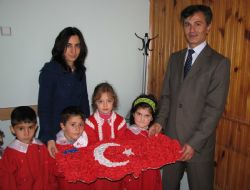 Ana Sınıfı Öğretmeni Hatice Karanfil ile birlikte 18 öğrencinin karton, Grafon ve simlerle hazırladığı Türk Bayrağı tablosu karşısında duygulu anlar yaşayan Okul Müdürü Sıtkı Toksoy, birlik ve beraberliğe her zamankinden daha fazla ihtiyaç duyduğumuz bir dönemde ana sınıfı öğrencilerinin hediyesi karşısında büyük bir mutluluk duyduğunu söyledi.