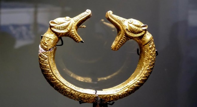 Muş’un Malazgirt ilçesinde 37 yıl önce yapılan kazılarda ortaya çıkarılan altın kaplamalı ve çift başlı ejder işlemeli tuğ ziyaretçileri kendine hayran bırakıyor.