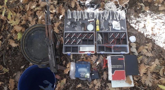 Bingöl'ün Genç ilçesi kırsalında operasyona çıkan jandarma timleri, toprağa gömülü bir bidon içerisinde kaleşnikof silah, fünye, araç anahtarları ve dürbün ile çok sayıda malzeme ele geçirdi.