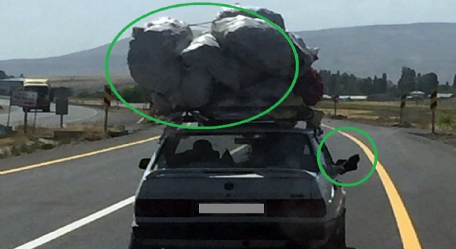 Bingöl-Erzurum karayolunda bir vatandaş tarafından cep telefonu kamerasına kaydedilen görüntüler, trafikteki tehlikeyi gözler önüne serdi. Şehirlerarası karayolunda otomobilin üzerine torbalarla yüklenen malzemeyle ilerleyen araç, trafik güvenliğini tehlikeye soktu. Araç içerisinde oturan bir kişinin ise ayaklarını camdan uzatarak dikiz aynasındaki görüşü engellemesi, tehlikenin boyutunu daha da arttırdı.   İHA