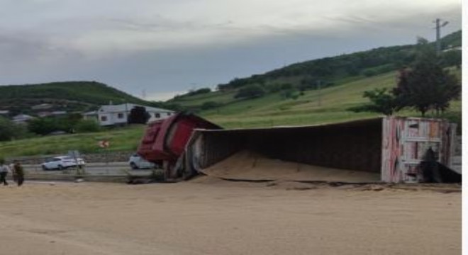 Olay, Ilıcalar beldesinde meydana geldi. Edinilen bilgilere göre, sürücüsünün direksiyon hakimiyetini kaybettiği tır yan yatarak devrildi. Tırın dorsesinde bulunan buğdayların yola savrulması trafikte aksamalar sebep oldu. Ekiplerin çalışmasıyla buğdaylar yoldan temizlendikten sonra trafik normale döndü.