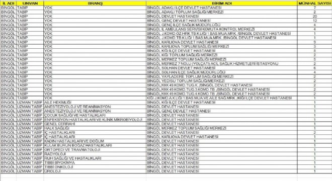 Sağlık Bakanlığı merkezi atama ile Bingöl’e 119 hekim ve uzman hekim ataması için kadro açtı. Yeni açılan kadrolar İl Sağlık Müdürlüğü sosyal medya hesabından duyuruldu. Buna göre Bingöl Merkez Devlet Hastanesi, Adaklı İlçe Devlet Hastanesi, Genç Devlet Hastanesi, Genç İlçe Sağlık Müdürlüğü, Bingöl İl Ambulans Servisi Komuta Kontrol Merkezi, Karlıova Devlet Hastanesi, Karlıova Toplum Sağlığı Merkezi, Kiğı İlçe Devlet Hastanesi, Bingöl Kiğı Toplum Sağlığı Merkezi, Bingöl Merkez Toplum Sağlığı Merkezi, Bingöl Merkez 7 No'lu (Yolçatı) Acil Sağlık Hizmetleri İstasyonu, Solhan Devlet Hastanesi, Solhan İlçe Sağlık Müdürlüğü, Yayladere Toplum Sağlığı Merkezi, Yedisu Toplum Sağlığı Merkezi, Kiğı İlçe Devlet Hastanesi, Çocuk Sağlığı ve Hastalıkları, Kadın Hastalıkları ve Doğum Hastanesine 119 hekim için kadro açıldığı duyuruldu.