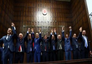 AK Parti Genel Başkanı ve Başbakan Ahmet Davutoğlu, TBMM grup toplantısında yaptığı konuşmada, "17, 25 Aralık kumpasları, MİT operasyonları, dışişleri dinlemeleri ile ihanet çeteleri çalışırken geçen yıl kararlı bir şekilde 30 Mart seçimlerine yürüdüklerini" belirterek, şöyle devam etti:"Birçok hesaplar yapıldı, aynen 2002'de olduğu gibi. Hani Genel Başkanımız milletvekili olmadığı için Başbakan olamaması sebebiyle o zaman AK Parti grubu dağılır diye düşünenler olduğu gibi, hani 2007'de e-muhtıra olduğunda AK Parti grubu sarsılır diye düşünenler olduğu gibi. Birileri sarsıldı ama AK Parti Grubu sarsılmadı. Hani parti kapatma davası açıldığında AK Parti'den büyük bir kopuş olur, herkes tek tek kendi şahsi hesabı içine girer diye beklentiler olduğu gibi. Geçen sene de birileri '30 Mart seçimlerinde bunlar yüzde 30'lara düşerler ve parçalanırlar' diyordu. Biz düşmedik ve parçalanmadık. Düşürecek olan da  kaldıracak olan da Allahımızdır, milletimizdir. Sonra o olmadı. Cumhurbaşkanlığı seçimine giderken adaylar arasındaki ihtilaflar ve parti içindeki parçalanmalar sebebiyle bu grup birliğini, beraberliğini bozar diye düşündüler. O da olmadı. Sonra olağanüstü kongreye giderken ve Başbakanlık, Cumhurbaşkanlığı görevleri tevdi edilirken, değişim yaşanırken iç ihtilaf çıkar diye beklediler ve işte aynen Hz. Musa'nın, Hz. Peygamber'in, Gandi'nin daha yakın zamanlarda Martin Luther King'in, bizim Horasan erenlerinin, istiklal ordularının omuz omuza vermesi gibi AK Parti grubu omuz omuza verdi, mahviyet içinde davasını şahsi hesaplarının önüne aldı ve bütün hesapları boşa çıkardı.