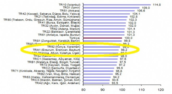 İstatistik Bölgeleri satınalma gücü paritesi açıklandı. Erzurum, Erzincan ve Bayburt’un yer aldığı Bölge fiyat düzey endeksi sıralamasında 26 bölge içinde 15’inci sırayı aldı. Bölge fiyat düzey endeksinin en düşük olduğu 12’inci bölge olarak kaydedildi. Erzurum Bölgesi 2017 fiyat düzey endeksi 98.2 olarak açıklandı. Bölge Türkiye ortalamasına göre yüzde 1.8 oranında fiyatların daha ucuz olduğu bölge olarak belirlendi.