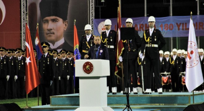 Cumhurbaşkanı Erdoğan, Türkiye Cumhuriyetinin köklü bir devlet olduğunu belirterek, “Son dönemde bölücü örgütün şehit ettiği Jandarmalarımıza bir kez daha Allah’tan rahmet diliyorum. Şairin de dediği gibi, ‘İnsan büyür beşikte, mezarda yatmak için ve kahramanlar can verir yurdu yaşatmak için’. Ülkesini yaşatmak, milletini korumak için can veren kahramanlarımızın her biri yüreğimizde sonsuza kadar yaşamaya devam edecek. Türkiye, çevremizdeki ve dünyadaki birçok devlet gibi sonradan kurulmuş, belgelerin veya projelerin eseri bir devlet değildir. İçinde bulunduğumuz Jandarma kurumunun dahi 180 yıllık bir geçmişi vardır. Unutmayın; bu devlet bir kabine devleti değildir. Bu devlet tarihe mal olmuş bir devlettir. Kara Kuvvetleri Komutanlığımız, bu yıl ordumuzda hala kullanılan; tümen, binbaşı, yüzbaşı, onbaşı gibi kavramların ortaya çıktığı yıllara uzanan 2 bin 228’inci kuruluş yıldönümünü kutladı. Pazartesi günü kendisinden kat kat kalabalık bir orduyu gün batmadan darmadağın ettiğimiz Malazgirt zaferimizin 948’inci yıldönümü için Malazgirt’te olacağız. Osmanlı’nın sadece devlet yapısının değil, askeri düzenin etkisi de günümüze kadar tüm dünyayı etkilemeye devam etmiştir. Alparslan, oradan yola çıktı ve Anadolu o zaman bizler için vatan oldu. Bugün de TSK dünyanın sayılı ordularından biri” diye konuştu.