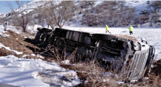 Gümüşhane-Bayburt karayolu Vauk dağı geçidinde buğday yüklü kamyon kontrolden çıkarak yan yattı. Kazada sürücü yaralandı.