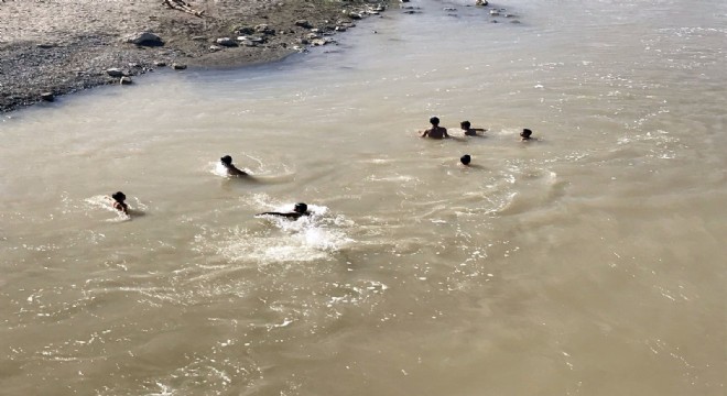 Horasan'da, yaşları 7 ile 15 arasında değişen çocuklar Aras Nehri'nin suyunda tehlikeli şekilde serinlemeye çalışıyor.