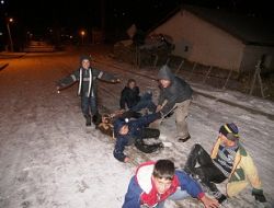 Kar yağışı ve havanında soğumasıyla birlikte buz tutan yollarda giyindikleri eski ayakkabılarla kayan çocuklar doyasıya eğlenirken buz tutan yollarda ise sürücüler zor anlar yaşıyorlar.Yaşları 8 ile 14 arası değişen çocuklar havanın soğuk olmasına aldırış etmeden eğlencelerine devam ediyorlar.