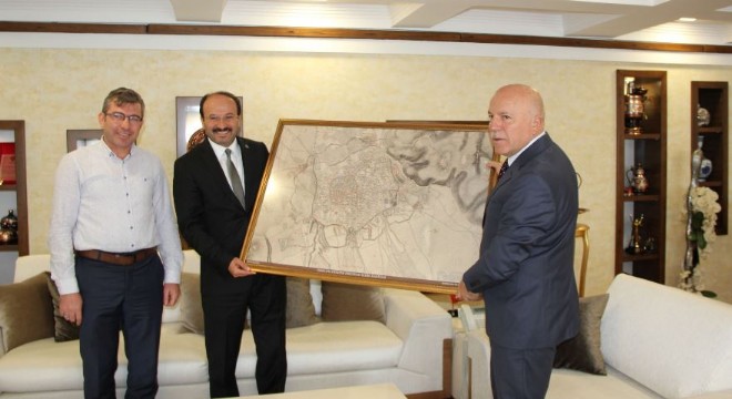 Konuklarını makamında ağırlayan Erzurum Büyükşehir Belediye Başkanı Sekmen’e Erzurum Teknik Üniversitesi Rektör Yardımcısı, aynı zamanda Erzurum Şehir Arşivi (ERŞA) kurucularından Prof. Dr. Murat Küçükuğurlu ve araştırmacı Murat Türker Tüfekçi’nin yoğun çalışmalarıyla hazırlanan Osmanlı döneminden günümüze 400 yıllık “Erzurum Şehir Haritası” ve “100. Yılında Fotoğraf ve Belgelerle Erzurum Kongresi Albümü” takdim edildi.
