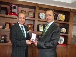 Başkan Küçükler daha sonra Yüksel Çelik’e Oltu taşından imal edilen kol düğmesiyle kravat iğnesi hediye etti.