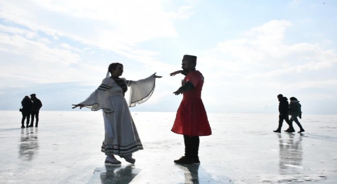 Ardahan’ın Çıldır ilçesinde yüzeyi buzla kaplanan Çıldır Gölü üzerinde iki genç Kafkas gösterisi sergiledi.