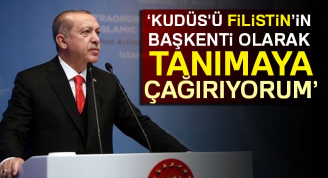 İslam İşbirliği Teşkilatının Olağanüstü Toplantısında konuşan Erdoğan, İslam dünyasının ’bağımsız Filistin’ talebinden asla vazgeçmeyeceğini belirterek, "Uluslararası hukuka, hakkaniyete sahip çıkan tüm ülkeleri Kudüs’ü Filistin devletinin işgal altındaki başkenti olarak tanımaya davet ediyorum" dedi.