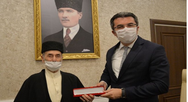 Vali Memiş, Necati Tutaş’a ziyareti anısına Oltu Taşı tesbih hediye etti.