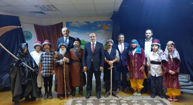 Şehitler İmam Hatip Ortaokulu tarafından sahnelenen Deli Dumrul oyununun ardından öğrencileri tebrik eden Vali Cüneyt Epcim ve Rahmi Güney öğrencilerle hatıra fotoğrafı çekildiler.