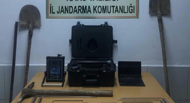 Olay yerinde yapılan aramada kaçak kazıda kullanılan 1 adet görüntülü define arama detektörü, 1 adet dizüstü bilgisayar, 8 adet define arama çubuğu, 2 adet kürek, 1 adet kazma, 1adet manivela demiri, 1 adet el feneri, 1 adet sırt çantası ele geçirilerek muhafaza altına alındı.