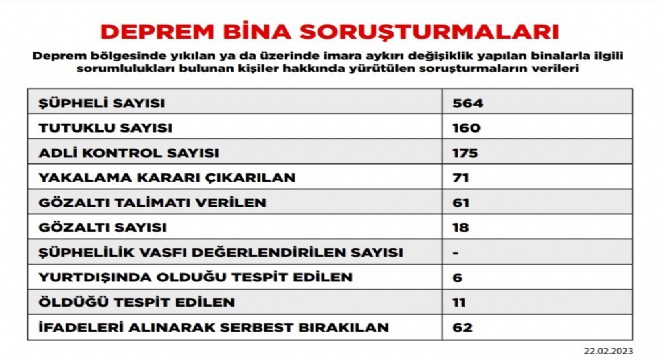Kahramanmaraş Pazarcık ve Elbistan merkezli 7,7 ve 7,6 büyüklüklerinde meydana gelen depremler sonrasında soruşturmalar devam ediyor. Bölgede yıkılan ya da üzerinde imara aykırı değişiklik yapılan binalarla ilgili sorumlulukları bulunan kişiler hakkında yürütülen soruşturmalar çerçevesinde tutuklu sayısı 160'a yükseldi.