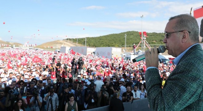 Ak Parti’nin 17 yıllık iktidarının alâmet-i fârikalarından birinin de ulaşım meselesi olduğunu ifade eden Erdoğan, sözlerini şöyle sürdürdü: “Hep derdim, yol medeniyettir: su medeniyettir. Yolunuz yoksa, suyunuz yoksa, siz gayr-i medenîsiniz. Nerede CHP varsa orada susuzluk, çöp var. Öyle mi? CHP’nin belediyelerinin olduğu yerlerde maalesef atık su. Susuzluk almış başını gidiyor. 6100 kilometreden devraldığımız bölünmüş yol uzunluğumuzu bugün 26 bin 764 kilometreye ulaştırdık. 79 senede 6100 kilometre yapıldı. Biz bunu 18 senede 26 bin 764 kilometreye ulaştırdık. Farkımız bu. İktidara geldiğimizde 1714 kilometre olan otoyol uzunluğumuzu bugün 2875 kilometreye çıkardık. Bölünmüş yol ile bağlı il sayısını, kara yolu tren sayısını 83’tden 367’ye, kara yolu tren uzunluğunu 50 kilometreden 473 kilometreye yükselttik. Vatandaşlarımızın hem mal, hem can güvenliğinde iyileştirmeler gerçekleştirdik. Vatandaşlarımızın yol konforunu arttırdık. Kaza riskini minimize ettik. Yaz tatilinde ve önümüzdeki bayram günlerinde yapacakları seyahatlerde trafik kurallarına uymalarını özellikle rica ediyorum. Tüm Türkiye’ye sesleniyorum. Ne olur, işte bu hafta kurban bayramına giriyoruz. Bakın acele giden, Allah göstermesin, ecele gider. Yollarda aman ha; bastırıp hele hele gece yolculuğu, bunlara çok dikkat edin. Sizi bekleyen büyüklerinize yavrularınıza kötü haber ulaştırmayın. Onun için de yolların kuralları vardır. Bu kurallara uyalım, bu kurallara uyarak seyahatimizi yapalım ki, bayramlarımızı acıya döndürmeyelim. Bunu özellikle sizlerden rica ediyorum. Bölünmüş yollar otoyollar, ilk defa inşa ettiğimiz hızlı tren hatları, sayı ve seferlerini arttırdığımız hava limanları, deniz taşımacılığı ile seyahatleri kolay ve güvenli hale getirdik. Ülkemizdeki motorlu araç sayısı 8 milyon 655 bin iken bugün 23 milyonu geçti. Buna karşılık hem yolculuk süreleri kısaldı, hem konfor arttı. Trafik kazalarıyla yaralanma ve ölüm oranları azaldı. Alt yapıyı güçlendirdik. Güvenli trafik anlayışı ile trafik kazalarının azaltılması yolunda önemli mesafe kat ettik. Bu yılın ilk 7 ayında trafik kazalarında yüzde 12’lik, ölümlü kazalarda yüzde 30’luk, yaralanmalı kazalarda yüzde 12’lik azalma meydana geldi. Bunu sürdürmenin yolu vatandaşlarımızın kurallara uymasından geçiyor. Yollarımız gayet rahat, konforlu, bayram sıkışıklığı sebebiyle varsın seyahat süresi uzasın, geride gözü yaşlı, gönlü kırık kimseyi bırakmayalım. Bursa’da ulaştırma yatırımlarını kesintisiz sürdürüyoruz. Şehrimizde hâl-i hazırda toplam maliyeti 1,5 milyar lira olan 18 kara yolu projemizin yapımı devam ediyor. Bunların tamamını da inşallah iki yıla kadar bitiriyoruz. Bursa’ya bu yakışır. Bursa-Bilecik hızlı tren projemizin tamamlanmasının çeşitli aksaklıklar sebebiyle biraz geciktiğini biliyorum. İnşallah sıkıntıları çözüp hem Ankara-Bursa, Bursa-İstanbul arasını 2 saat 15 dakikaya düşürecek bu hattı mutlaka sizlerin hizmetine sunacağız”.