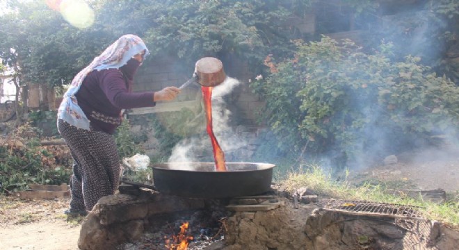Zahmetli bir iş olduğu için pekmezi ihtiyaçları kadar yaptıklarını aktaran Tekinh," ilk başta üzümü sağdık getirip sıktık ondan sonra onun toprağını kattık. 100 kilogram üzüme 1 kilo toprak koyduk. Üzüm suyunu getirip kazana bırakırız kazanda kaynadıktan sonra tortusunu alırız. Bir defa kaynamasıyla süzer dibindeki toprağı temizledikten sonra yayvan bir kapta bu sefer onu pekmez olmaya bırakırız. Bir diğer pekmez de kaynarını aldıktan sonra onu güneşe alırız güneşte olgunlaşır. Güneşte olgunlaşan pekmez daha kaliteli oluyor. 9’uncu aydan itibaren pekmez yapımı başlar. Ama en iyisi 10 ve 11’nci ayda yapılandır. Sıcak zamanda da yapılıyor ama üzüm tam şekerini almamış oluyor o dönemde bu zamandan sonra üzüm tam şekerini aldığı için pekmez kaliteli olur” dedi.