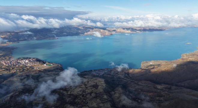 Elazığ'da karla kaplı Hazarbaba Dağı ve eteğindeki Hazar Gölü, bulutlarla birlikte kartpostallık görüntüler oluşturdu.
