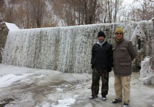 Vatandaşlar, buz tutan derede cep telefonlarıyla fotoğraf çekinmeyi de ihmal etmediler.