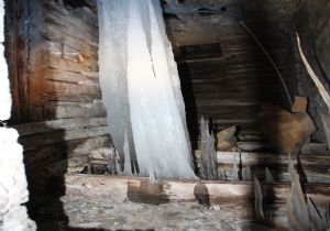 Oltu ilçesinde Tuncay Vural’a ait çay ocağının bodrum katında oluşan yaklaşık 5 metre boyundaki buz kütlesi, eski binaya adeta buzdan direk desteği oluşturdu.