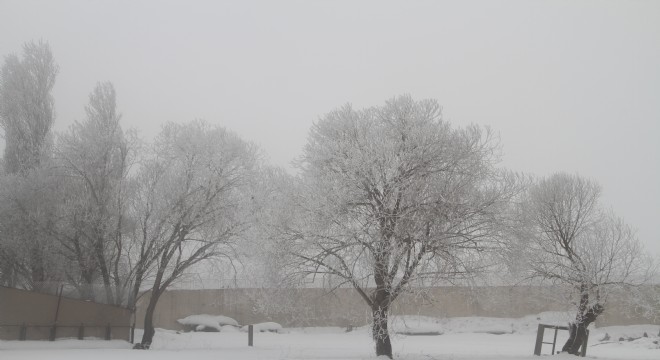 Türkiye’nin en soğuk yerleşim yeri olan Göle’de soğuk havayla birleşerek kırağı tutan ağaçlar, kartpostallık görüntü oluşturdu.