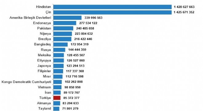 Türkiye, 85 milyon 372 bin 377 kişi nüfusu ile nüfus büyüklüğüne göre 194 ülke arasında 18’inci sırada yer alırken, dünya toplam nüfusunun yüzde 1,1'ini oluşturdu.